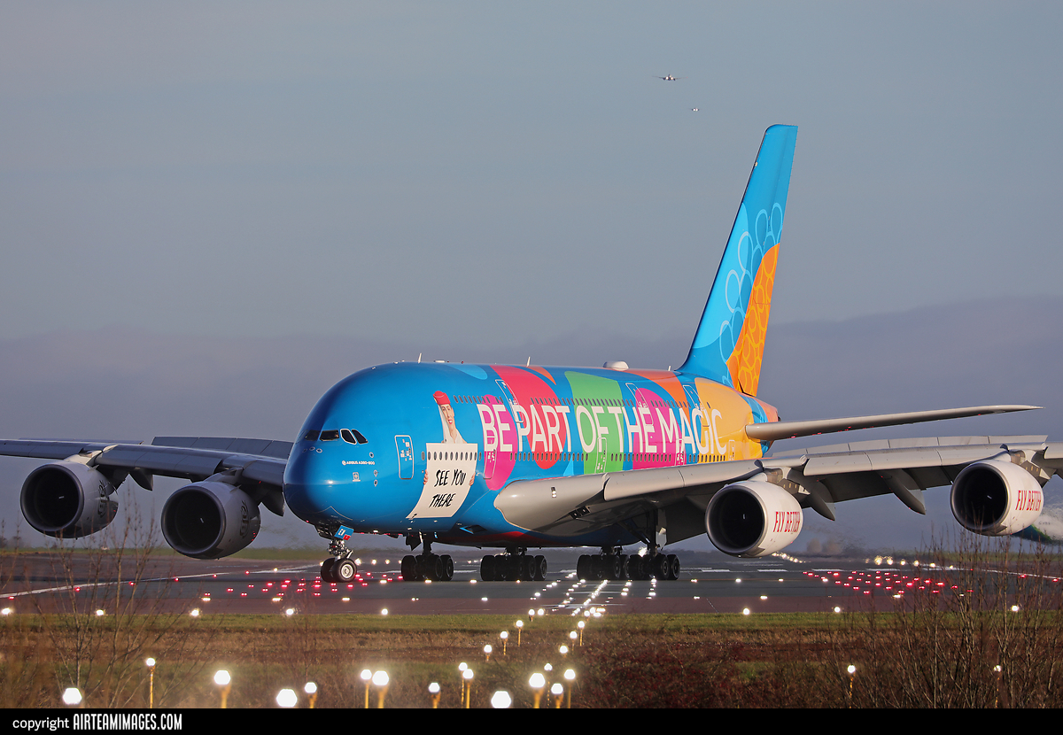The Airbus A380 is a four engined long range wide-body airliner. It is the largest airliner in service, with 2 full length decks available for passengers. Features fly-by-wire controls and a glass cockpit fitted with side control sticks.