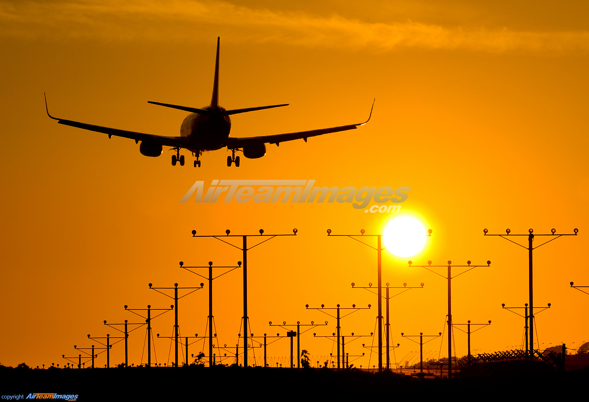 - A Boeing 737 landing at LAX during a nearly cloudless sunset