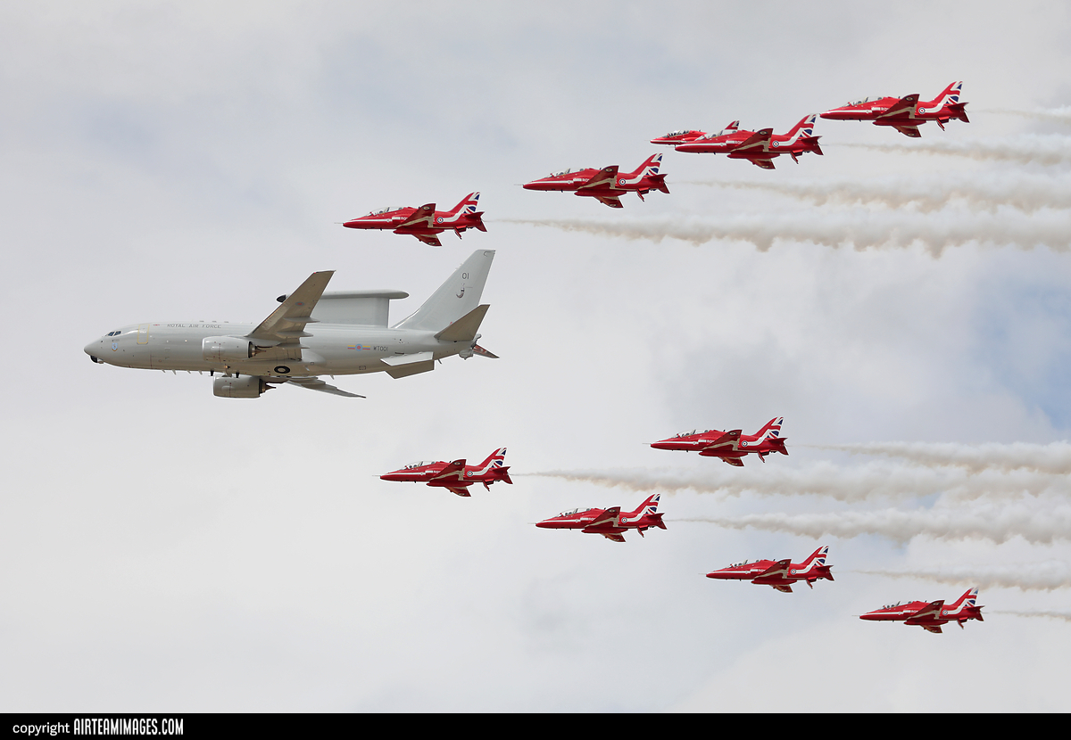 - RAF Boeing E-7A Wedgetail AEW.1 WT001 performing a flypast with the Red Arrows at RIAT 2025.