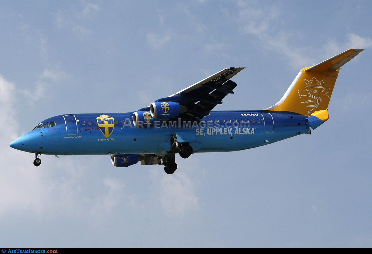 - One of Malmö Aviation's nine RJ100 regional four-engined jets arrives at Copenhagen Airport. It is painted in a colour scheme celebrating Swedish football.